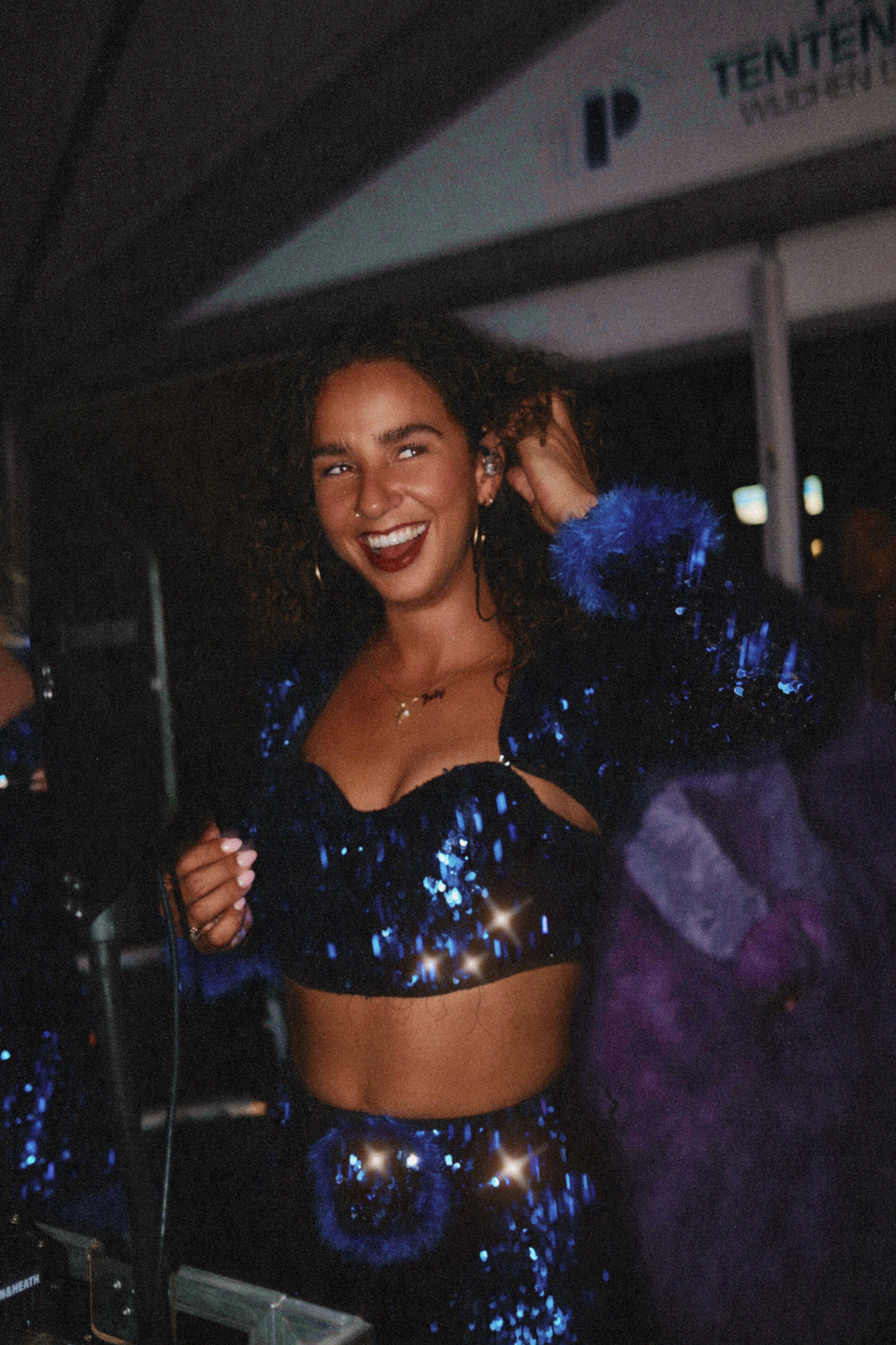 Als een van de twee stralende vocalisten in de act, brengt ze haar unieke flair en onmiskenbare charisma naar het podium.